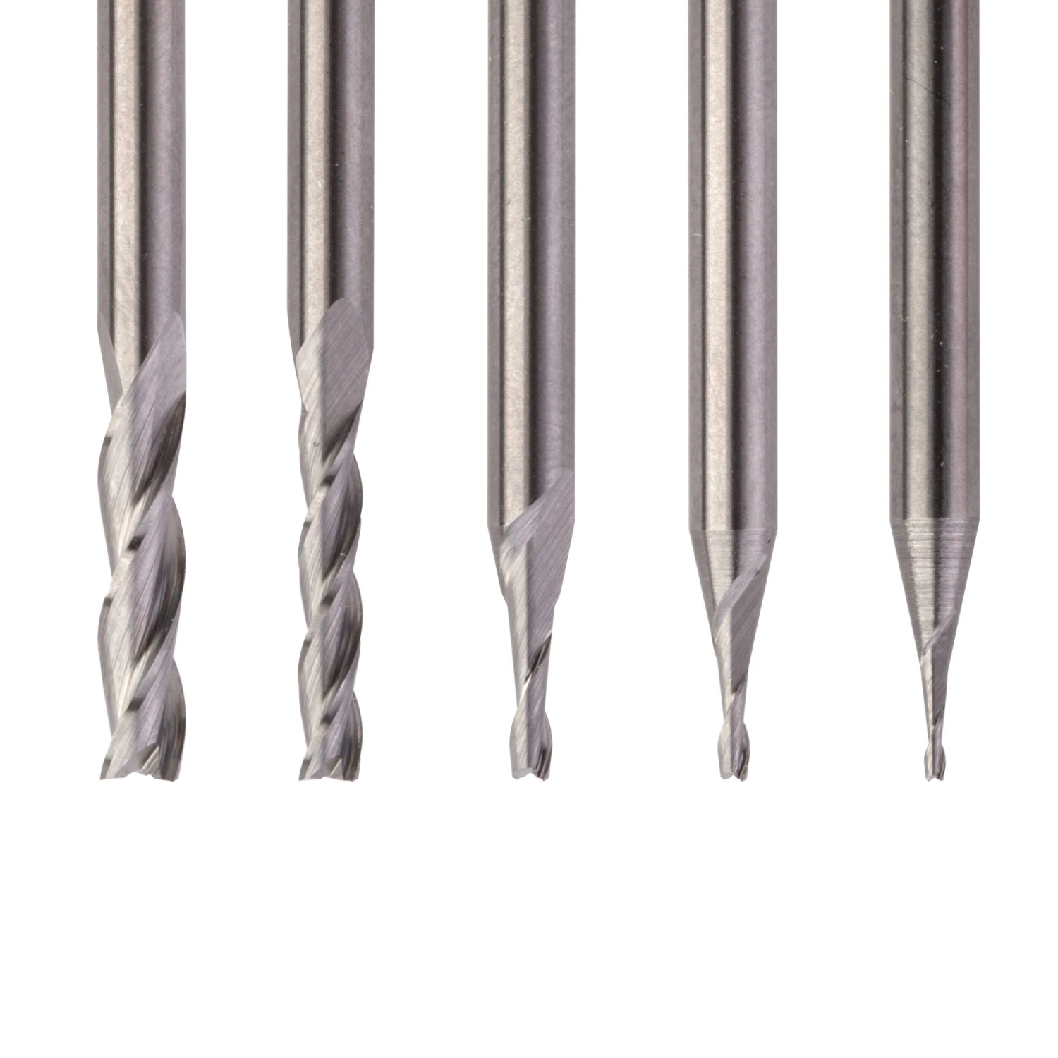 Made of long lasting solid carbide, these bits will stay sharp job after job. They can be used with both Dremel and Foredom tools, routers and laminate trimmers, and CNC machines.