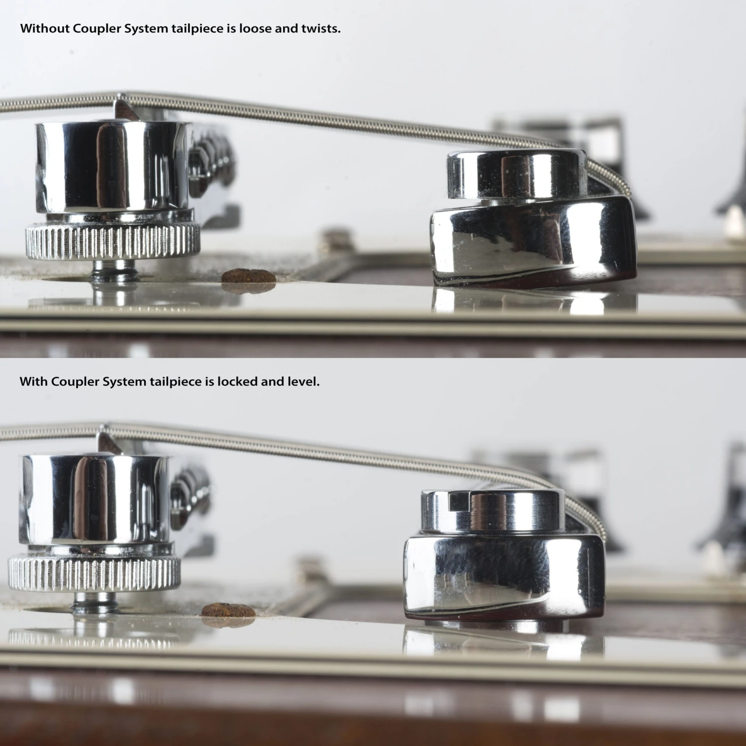 The replacement posts and spacer lock the tailpiece solidly against the guitar’s bushings with zero movement or loss of tone. The result is excellent transfer of vibration from the strings to the body. Not only that, the Coupler also eliminates the “lean” of tailpieces that don’t sit level, which also increases sustain and resonance.
