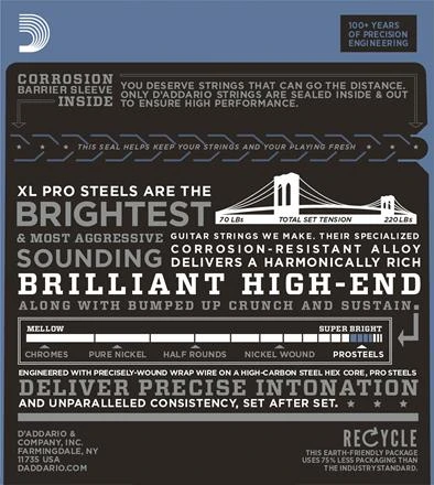 D’Addario XL ProSteels utilize a highly magnetic, corrosion-resistant steel alloy that delivers super-bright tone without shrill overtones. They offer a palette of harmonically rich, brilliantly penetrating highs combined with pronounced, tight-and-tough lows. If you’re looking for more crunch, bite, and sustain, ProSteels are the choice for you.