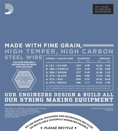 Regular Light gauge Unique highly magnetic steel alloy offers brighter, crunchier tone and increased sustain Environmentally friendly, corrosion resistant packaging for strings that are always fresh Made in the U.S.A. for the highest quality and performance String Gauges: Plain Steel .010, .013, .017, ProSteels Wound .026, .036, .046