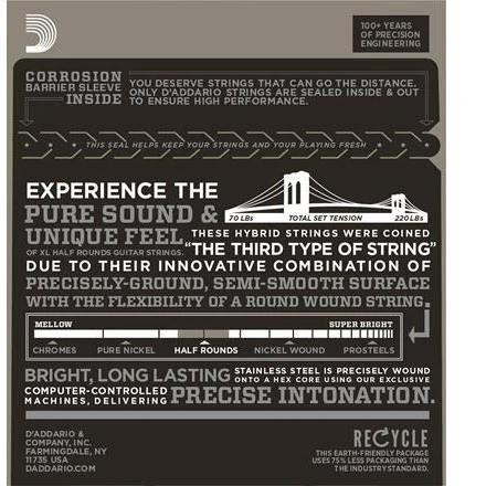 D’Addario Half Rounds Electric Guitar Strings are round wound with stainless steel and then precision ground leaving the outer surface smooth and “semi flat.” The result is a string with the tone and tension characteristics of round wound strings, with a smoother feel, similar to flat wound strings.