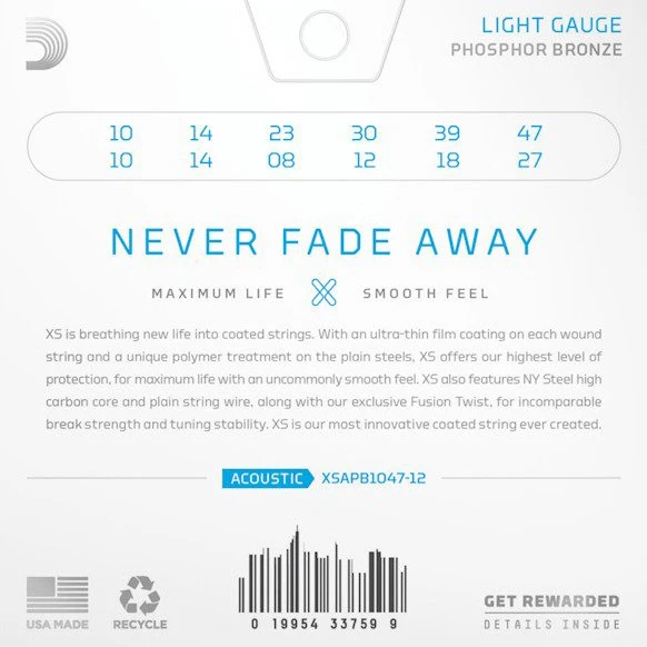 “Born from our greatest breakthrough in string innovation, XS Phosphor Bronze strings have the longest life of any D’Addario acoustic guitar string. The XS coating gives our warm, balanced phosphor bronze strings maximum life, with an uncommonly smooth feel. Made with a NY Steel core, phosphor bronze wrap wire, and Fusion Twist technology—XS coated acoustic guitar strings have incomparable break strength and tuning stability and dramatically increased lifespan.”
