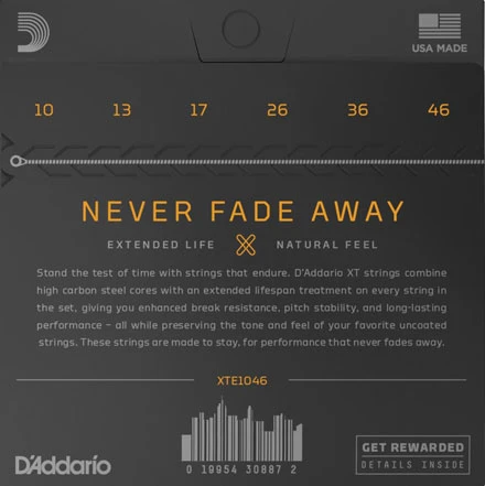 “Stand the test of time with strings that endure. D’Addario XT strings combine high carbon steel cores with an extended lifespan treatment on every string in the set, giving you enhanced break resistance, pitch stability, and long-lasting performanceāall while preserving the tone and feel of your favorite uncoated strings. These strings are made to stay, for performance that never fades away.”