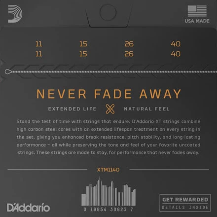 “Stand the test of time with strings that endure. D’Addario XT strings combine high carbon steel cores with an extended lifespan treatment on every string in the set, giving you enhanced break resistance, pitch stability, and long-lasting performance—all while preserving the tone and feel of your favorite uncoated strings. These strings are made to stay, for performance that never fades away.”