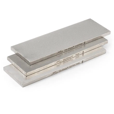 Industrial diamond-coated steel blocks. Excellent for putting a razor edge on chisels and knives, we discovered they’re also great for leveling frets!