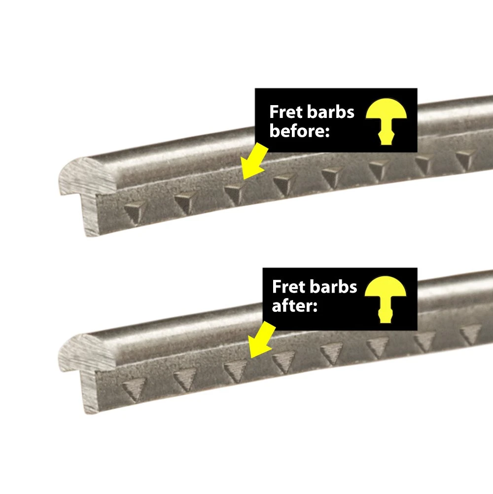 The Fret Barber lets you “take a little off the sides” to adjust the width of the fret tang by removing metal from the barbs. This way, you can control how much force is needed to press the frets into the slot.