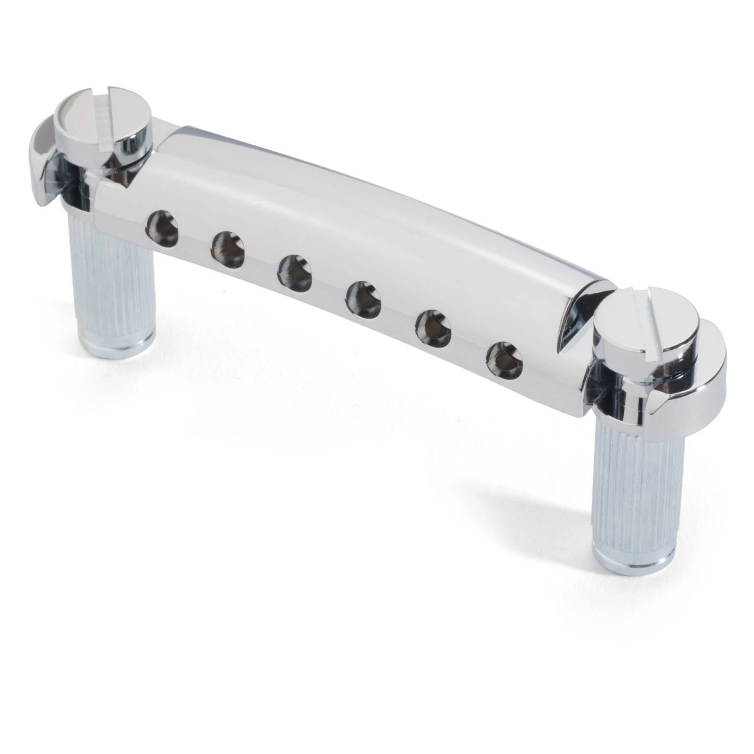 The familiar zinc die-cast bar tailpiece for solidbody guitars, with height-adjustable metric (M8 x 1.25) or U.S. (5/16-24) threaded mounting studs and knurled bushings.