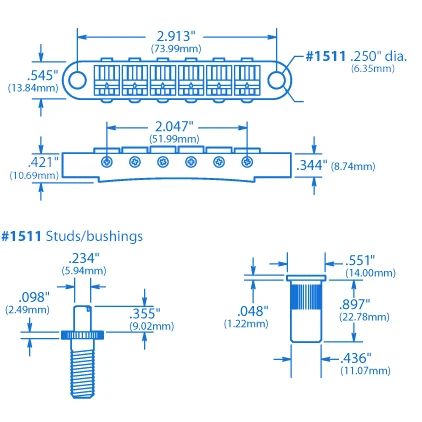 The metal saddles have helpful starter grooves to guide your slotting files. Intonation screws are retained by mini hex nuts. Includes threaded thumbwheel studs and bushings. Use an 11mm drill bit to install the bushings.