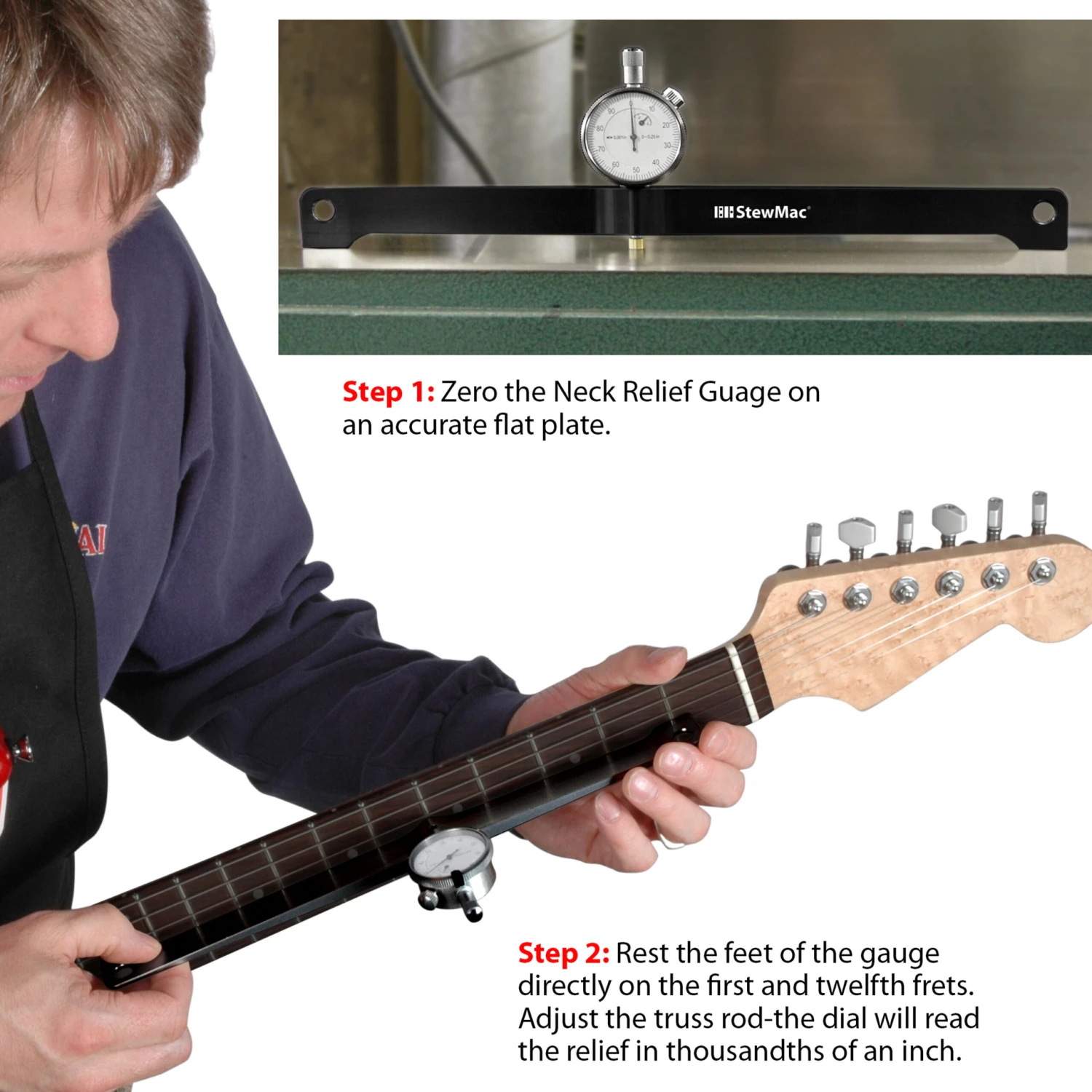 Our Neck Relief Gauge helps you quickly and precisely adjust guitar fretboard straightness (for comfortable playability without fret buzz). It accurately measures the amount of variation from a dead flat position, to take the guesswork out of adding or subtracting neck relief as you adjust the truss rod.