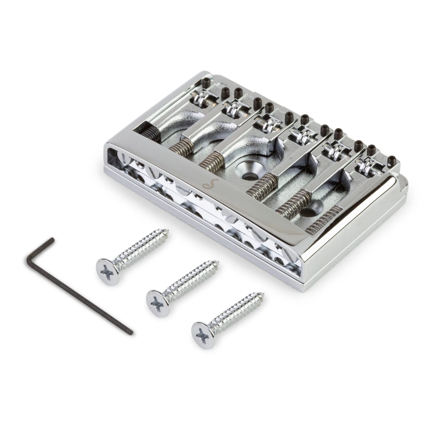 Low-friction roller saddles adjust for intonation and height, and for string spacings from 2″ to 2-3/16″ (50.80mm to 55.56mm). The strings mount at the rear of the bridge. Screws included.