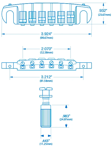 Two Allen screws adjust the overall intonation, and each saddle fine-tunes individually, with 9mm of travel. Use an 11mm drill bit to install the bushings.