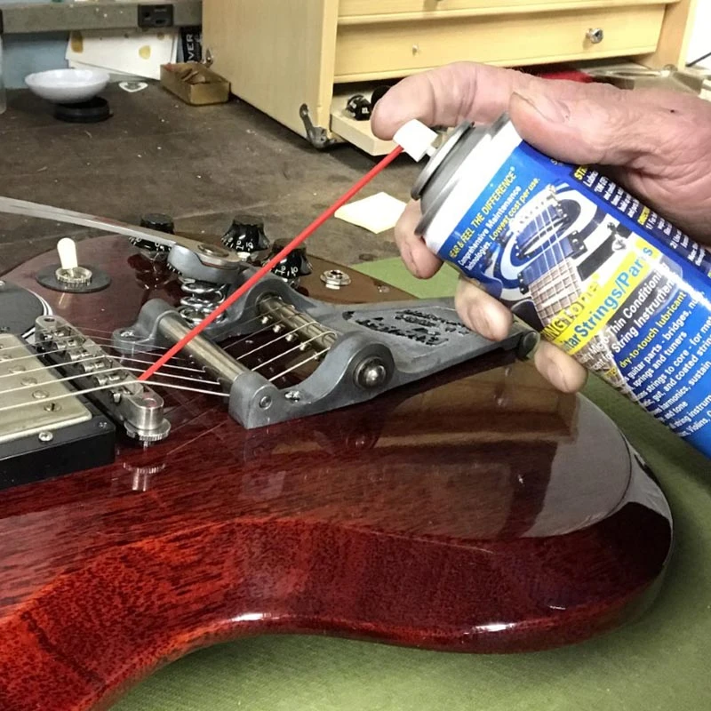 Where STRINGTone really shines is cleaning, conditioning, and lubricating your hardware. Bridge saddles, tremelos/vibratos, and nuts all function and play better when clean and lubricated. Unlike other spray or powdered lubricants, STRINGTone leaves no residue, and does not build up or leave a sticky feeling. All you’ll notice is better performance: cleaner bends, dive bombs, and silky vibrato.