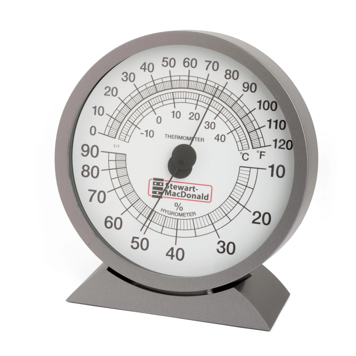 Excess dryness makes wood shrink and crack. Excess humidity swells wood and blushes newly sprayed finishes. Our large, easy to read gauge monitors Fahrenheit/Celsius temperature and relative humidity in workshops, wood storage areas, guitar display cabinets and finishing rooms.