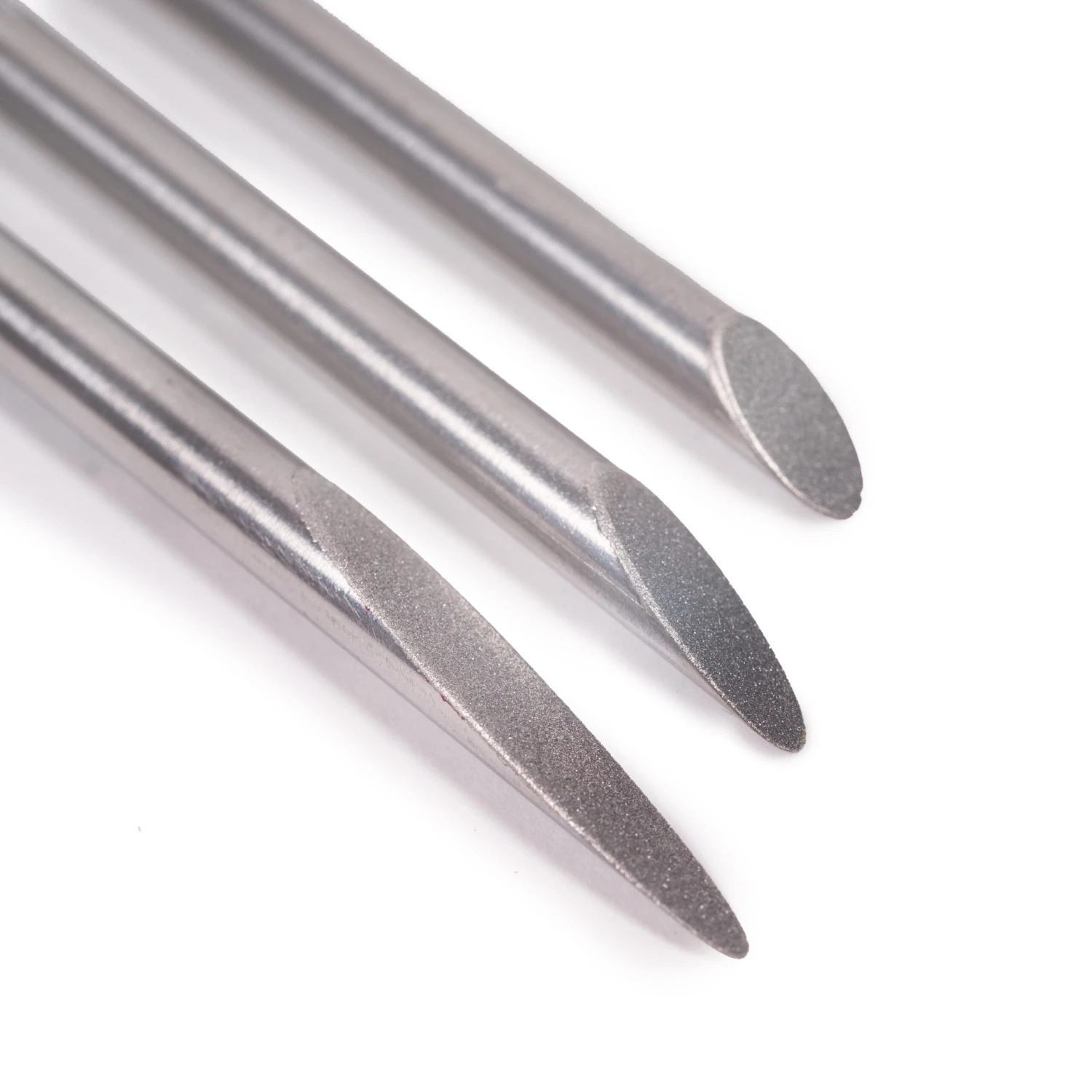 With three different angles of 300-grit diamond abrasives you can easily reach the entire fret from ends to center. The stainless steel construction and knurled handles gives you pinpoint control to dial in the perfect shape and crown for your frets.